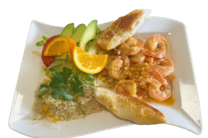 shrimp sautéed in garlic sauce served with white rice, beans, lettuce, tomato, sour cream and avocado slices