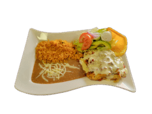 Three rolled-up corn tortillas filled with your choice of meat (shredded chicken or ground beef),topped with red enchilada sauce and…