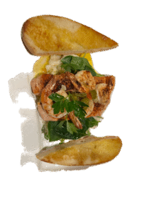 6 oz grilled salmon topped with shrimp, herbs, butter, lemon served on a bed of mashed potatoes and spinach