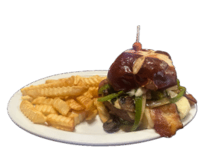 beef burger topped with your choice of cheese (American, Cheddar or Swiss), lettuce, tomato. onions and pickles on a brioche…