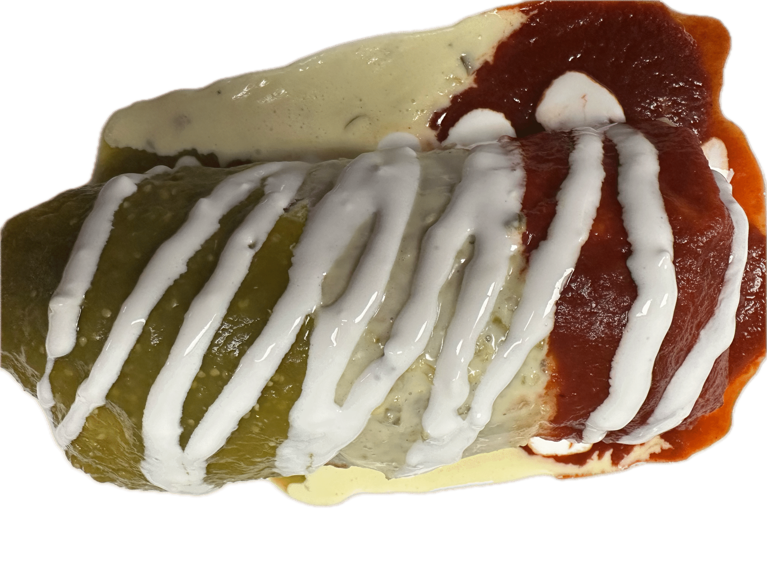 one flour tortilla stuffed with grilled steak, refried beans, rice, lettuce, pico de gallo, and sour cream topped with cheese sauce, green tomatillo sauce, and a zesty red sauce