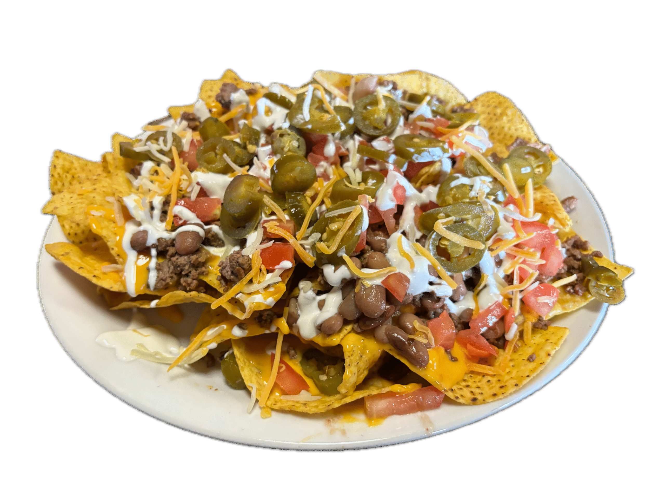 Fresh corn tortilla chips made in house, topped with cheddar cheese, beans, sour cream, tomatoes, jalapeños and your choice of meat (ground beef, shredded chicken)