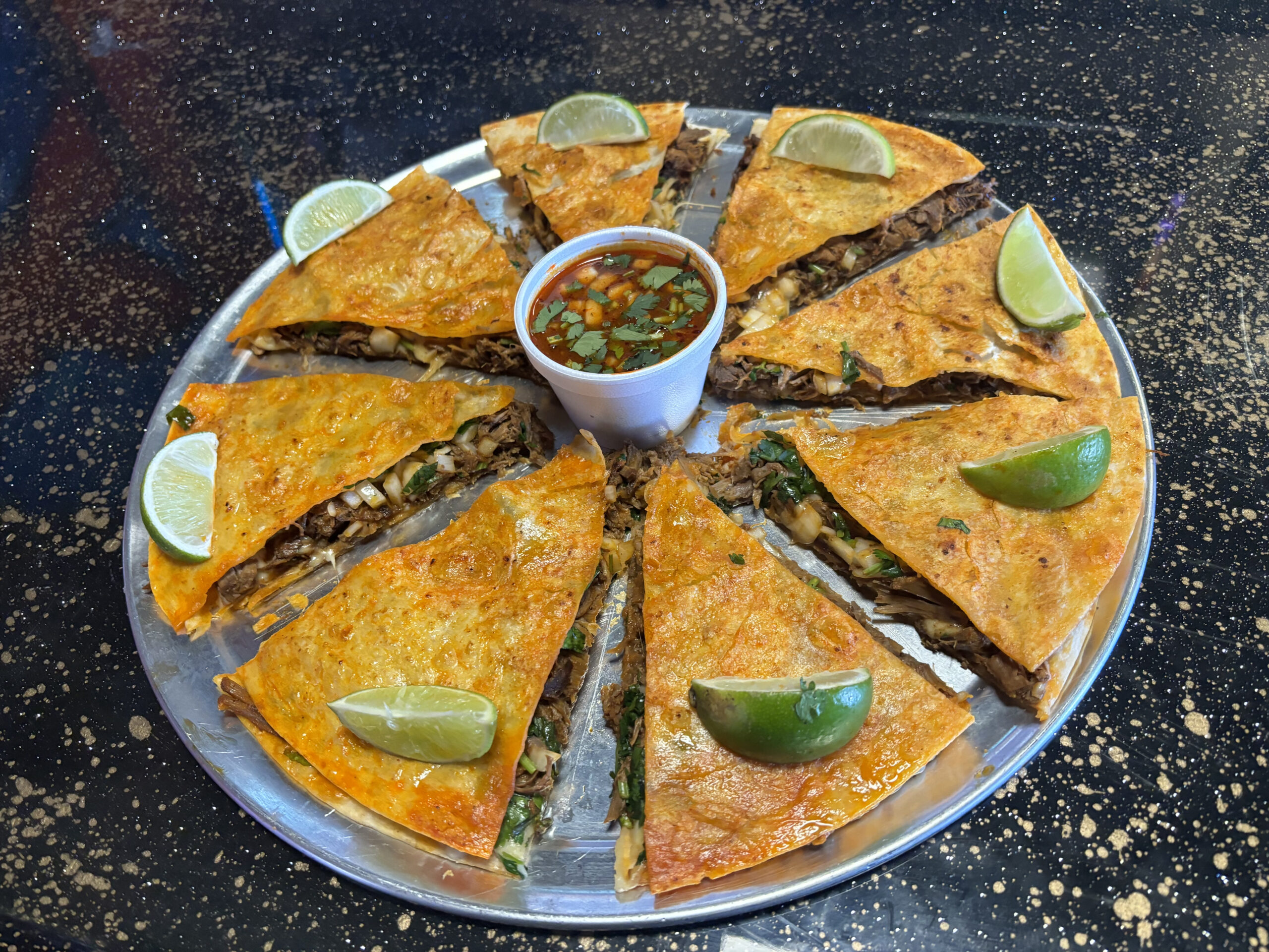 2 flour tortillas stuffed with mozzarella cheese, birria, cilantro, onion with consome on the side