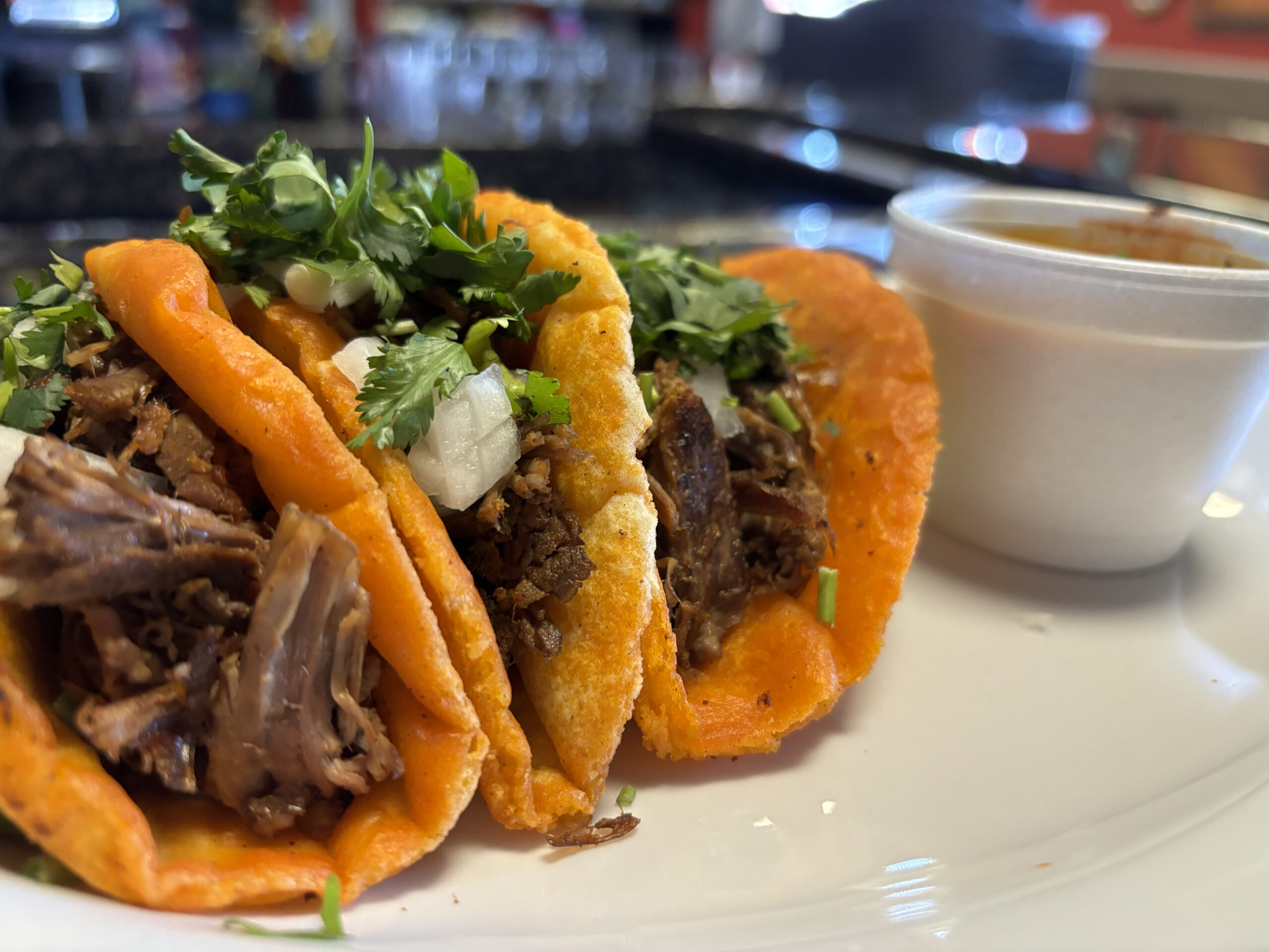 3 handmade corn tortilla in birria style broth, cooked to perfection on the grill, stuffed with mozzarella cheese, beef birria, chopped onions, cilantro and accompanied by a traditional mexican birria style beef soup broth
